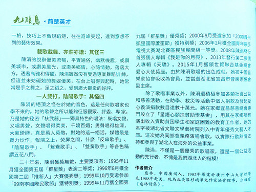 由著名湖北籍歌手陈涓演唱的《“九头鸟”之歌》,以楚剧说词开腔起头,以男声女对唱穿插,用合唱造势,曲调完全不同与过去陈涓演唱的三峡民歌和通俗歌曲风格,曲调有一种运动之美,更兼具调皮的味道,让人听得有劲。但演唱的内容却在说古颂今,颂扬湖北人的智慧、品德和自强不息的精神,因此,歌曲又透视着一种特有的庄重,这种庄重,是幸福的庄重,是自豪的庄重,是美妙的庄重。