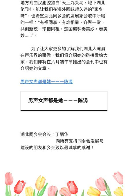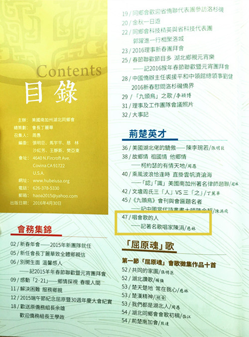 为感谢陈涓的演唱,美国南加湖北同乡会在《九头鸟》创刊号上,以“唱会歌的人”为题,大篇幅推介了陈涓,并称陈涓是“湖北人的骄傲”。并将陈涓演唱的男女声对唱歌曲《“九头鸟”之歌》作为湖北同乡会会歌。《九头鸟》杂志被武汉大学图书馆永久收藏。