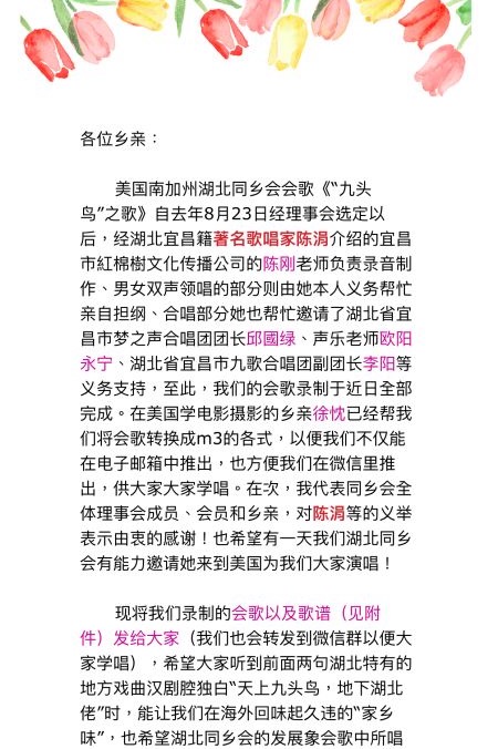 歌声流畅、飘逸而热烈,表达了旅居美国的湖北人对家乡的思念,以及对祖先的赞颂和自豪感。